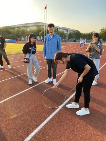 在开阔的操场上,有这样一群身影,用绑带和铁环传递着快乐。