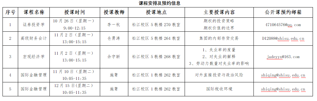 从10月26日开始,国际金融贸易学院将开展“课程思政“系列公开课。按照开课时间排序,先后会有李一杭博士、仓勇涛副教授、余宇新副教授和施箐博士带来《证券投资学》、《高级财务会计》、《宏观经济学》和《国际金融管理》的公开课课堂。欢迎全校师生参与!您可通过发送邮件进行预约。