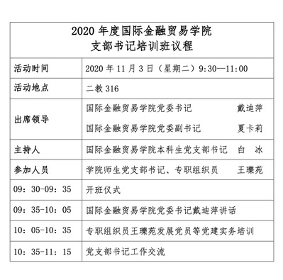 为扎实基层党组织建设,落实从严治党要求,强化基层党支部书记主体责任,进一步提升基层党支部书记的思想政治素质、业务工作水平和履职担当能力,发挥骨干和带头作用。经研究,国际金融贸易学院党委决定开展支部书记培训。