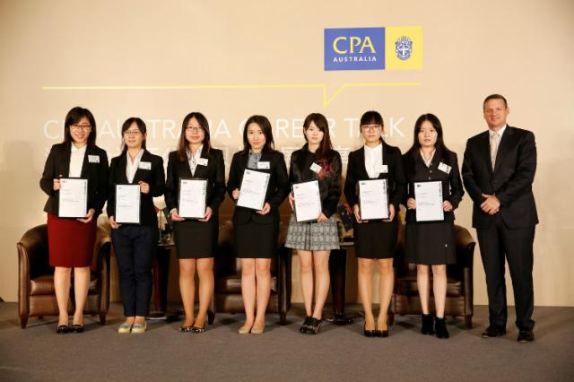 在随后举行的职业发展分享会上,澳洲会计师公会首席运营官Mr. Jeff Hughes、大中华区总监Ms. Deborah Leung及华东华中区委员会会长Mr. Kenny Lam三位澳洲资深注册会计师亲临现场,与在座即将走向职场的同学们分享他们认为最重要的“职场杀手锏”。Jeff先生为7位来自不同高校的澳洲会计师公会卓越奖学金获得者颁发了证书,我院2012级会计学专业学生梁佳雯、王蓓蓓、王佳雯荣膺该项荣誉并受邀上台领奖。