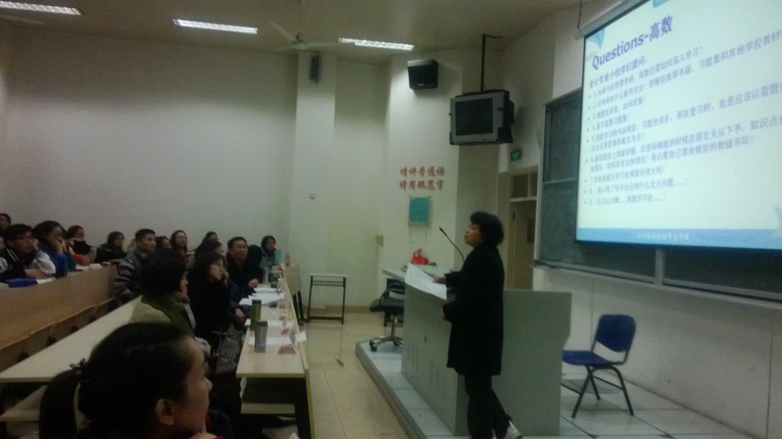 为让新生尽快适应大学的学习生活、改善学习方法、提高学习效率,以及培养良好的学习习惯,金贸学院于12月2日下午5时在2157举办了13级全体师生学习方法经验交流会。副院长张瑾老师、仓勇涛老师,英语教学部主任陆远老师,一年级全体精读、数学、会计老师等共计12名老师出席了本次交流会。同学们踊跃提问,老师们热情解答。问题遍及各科的学习方法、学习技巧、复习方法及课后补充材料。此外对于学生较为关心的热点问题如考证、出国、就业、专业内课程之间的联系、以及学习工作的时间平衡等等,各位老师也逐一详细解答。