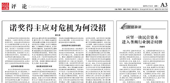 经济理论研究是为理性的经济政策服务的。以诺贝尔奖得主为代表的经济学家们,在危机前后所表现出的令人大跌眼镜的预警与应对水准,既折射出本次经济与金融危机的异常复杂性,更反映了一向优越感十足的西方经济学和经济学家们长久以来的自私与固有的局限。某些浸润了太多工具理性的经济学家们,越来越难以成为世界经济发展的建设性力量。