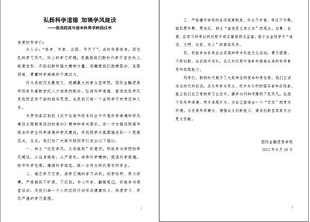 本次在全校范围内开展的科学道德和学风建设主题教育活动既是各院系为加强科学道德和学风建设开展的一次联合行动,也是引导高年级学生树立科研诚信意识、提高科学道德素养的重要课堂,必将对推动形成风清气正、求真务实的优良学风,营造有利于自主创新和人才成长的科研环境发挥积极作用。作为我校历史最悠久、规模最大的复合型学院,国际金融贸易学院肩负着新世纪人才培养的使命,弘扬科学道德、营造优良学风是学院坚定不渝的指导思想。学院将进一步强化认识,着力建立科学道德和学风建设教育工作长效机制,把宣讲教育工作贯穿于本科生培养全过程,使之成为本科生培养的重要环节。相信经过学校、学院及全体师生的共同努力,金贸学院的科学道德和学风建设工作必将迈出新步伐、彰显新成效、实现新跨越。(金贸学院学生工作组)