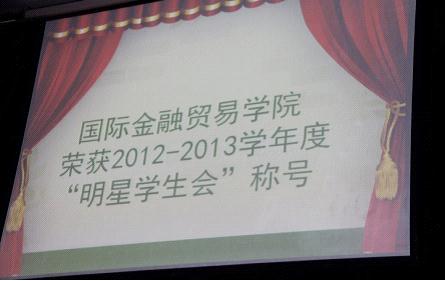 经过紧张而有序的计分环节,最终【国际金融贸易学院】摘得桂冠,荣获2012-2013学年度“明星学生会”称号,此外金院大型系列活动“华尔街经济文化节”荣获最具经济风尚奖。