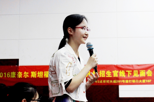 首先,康奈尔大学招生官为以图文结合的形式为我们简单介绍了康奈尔大学的近况,包括校园地点、人数以及历史成就、学生成就等等。作为世界顶级私立研究性大学的代表,康奈尔大学招生官以其丰富的招生经验,与我们分享一系列招生建议,并重点强调了“要诚实,不要夸大或歪曲。”在她的建议中,提到了兴趣与学术研究的关系,以及教授对毕业生申请的评论与看法,让同学们了解到名校需要学生们对专业有高度的热情。该环节最后,康奈尔大学招生官在现场抽取幸运观众,送上了她远从美国带来的精美礼物,并与三名幸运观众进行合影。