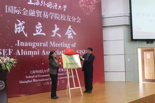 随后是金贸学院校友会的成立仪式。金贸校友会会长1999届毕业生沈忱首先宣读了金贸校友会理事会成员名单,接着由学校校友会秘书长黄震宇老师宣读上海外国语大学校友会贺函,然后由上海外国语大学党委副书记钱玲、副校长周承进行金贸校友会LOGO的揭牌仪式。