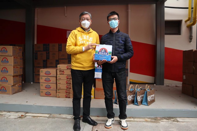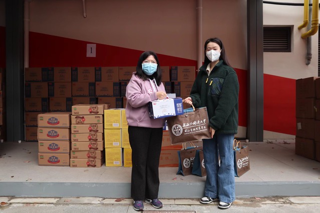3月22日,首批近千箱牛奶、酸奶,1500多份面包点心送至上外虹口校区学生生活区。校党委书记姜锋,校党委副书记、纪委书记钱玲接受捐赠。
