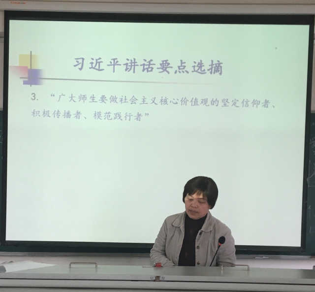 此次组织生活会由教工支部书记罗雪梅老师主讲。罗老师重点选摘了习近平总书记在会议上的讲话,并结合教学实践中教书育人相结合的案例发表了自己的体会。罗老师作为学院资深教师,带领学院的党员及入党积极分子学习社会主义核心价值观、党章、践行“两学一做”,交流学习心得。罗老师还分享了她平日里关心学生,让很多学生重拾信心的案例,以鼓励老师们在做好教学工作的同时,关注学生的思想及精神面貌,主动关心学生的学习和生活,为国家和社会培养积极向上、努力进取的人才。