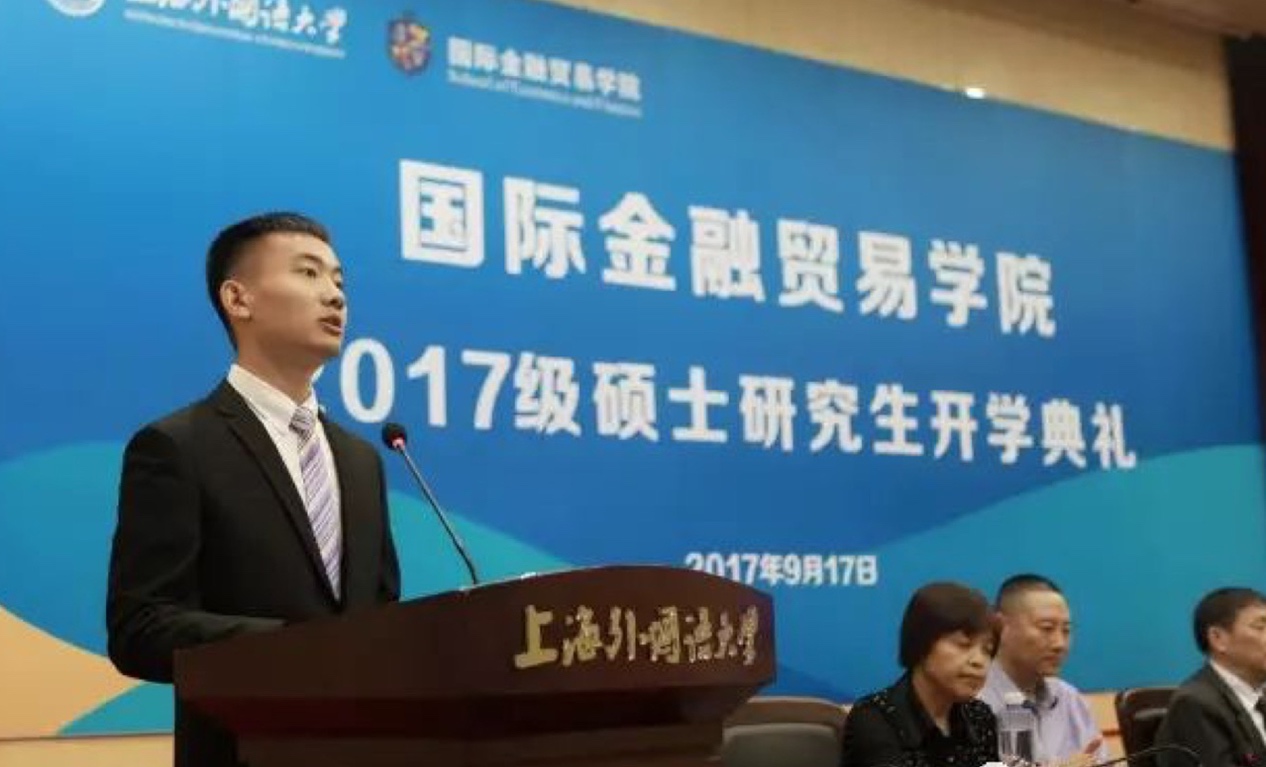 2017级应用统计学硕士研究生江泽勇作为新生代表发言。他表示因为上外梦让大家聚集在此,同学们对于新生活充满了感激和期待。他以找寻自己和革新自我为目标,希望能勇敢超越自我成为一名优秀的上外人。