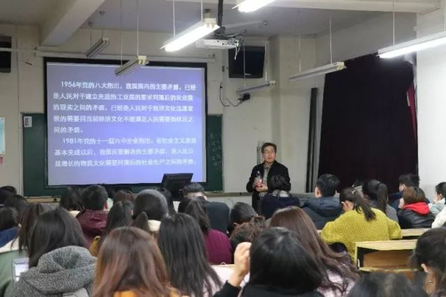 随后,赵鸣歧老师向大家详细阐述了社会主要矛盾的转化,用生动形象的语言帮助大家在笑声中更加深入理解了何为“人民的需求”。“在当今承前启后、继往开来的时代中,也存在着不少问题”,赵鸣歧老师讲解的“三个飞跃”、“三个并存”等问题,引发了大家对于当今热点问题的深思。
