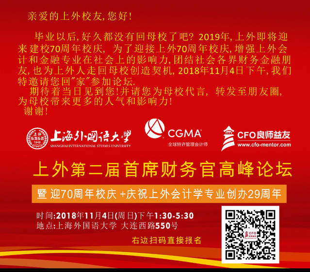 2018年11月4日,上海外国语大学校友会、上海外国语大学国际金融贸易学院联合CGMA全球特许管理会计师协会、CFO良师益友公益平台共同举办的“第二届首席财务官高峰论坛暨迎70周年校庆+庆祝上外会计学专业创办29周年”活动将在上海外国语大学虹口校区(大连西路550号)开幕。