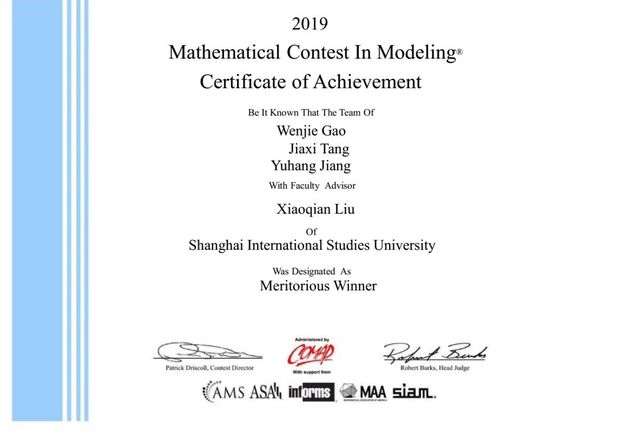 近日,我院会计专业学生高文杰、蒋雨航及其合作者唐嘉希在刘晓倩老师的指导下喜获美国大学生数学建模竞赛一等奖。