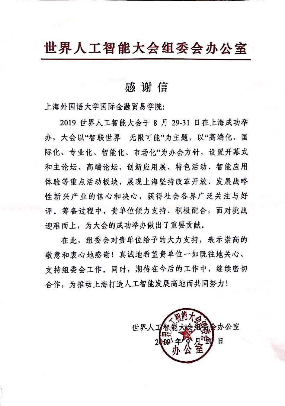 2019世界人工智能大会于2019年8月29-31日在沪举行。8月28日,作为大会的预热大戏,由上海市经济和信息化委员会指导、上海外国语大学承办的特色论坛“人工智能驱动高质量发展——构建人工智能生态链论坛”在上外虹口校区顺利召开。近日,世界人工智能大会组委会办公室向我校国际金融贸易学院发来感谢信,对学校为2019世界人工智能大会的成功举办所做出的突出贡献表示衷心感谢。