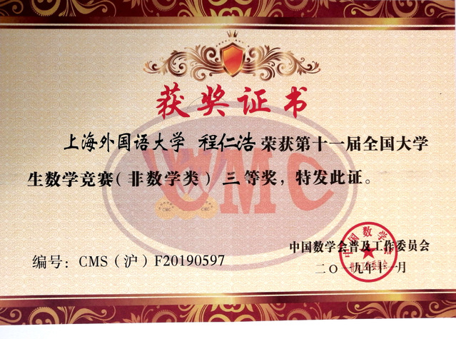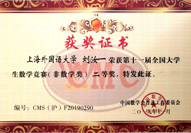 2019年12月27日,第十一届全国大学生数学竞赛上海赛区颁奖大会在华东师范大学举行。上海外国语大学国际金融贸易学院姚入榕和程仁浩同学,分别获得非数学类二等奖和三等奖,日语学院刘汝一同学获得非数学类二等奖。