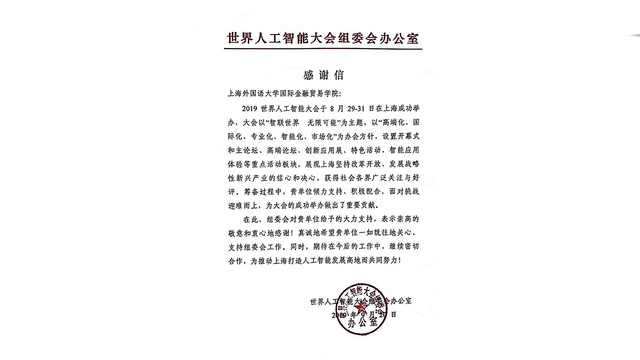 为了适应数据科学与大数据技术专业实践发展的相关需求,国际金融贸易学院不断加大与业界知名企业的实质性合作;并在上海市经济和信息化委员会等政府部门的指导下,举办了大数据与人工智能领域的高水平会议,在业界产生了广泛影响。2019年8月,学院成功举办了以“人工智能驱动高质量发展——构建人工智能生态链”为主题的2019年世界人工智能大会上海外国语大学特色论坛。在学术界、业界和社会产生了广泛的影响。显著提升了学校和学院在大数据与人工智能领域的知名度与影响力。2019年世界人工智能大会组委会还特别致信表示感谢。