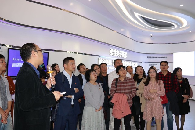 最后,老师们前往清华柔性电子研究院参观。浙江清华柔性电子技术研究院是浙江省政府与清华大学共同打造的关于柔性电子技术产业发展技术高地的载体,是柔性电子技术产业的科研高地和技术策源地。研究院创新管理机制,将科技与党建相融合,相关工作人员向老师们介绍了研究院的发展情况、科研成果、人才引进及培育等方面的工作。