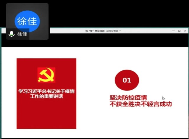 支部书记徐佳带领大家一起学习习近平总书记关于疫情防控的重要讲话。疫情发生以来,习近平总书记亲自指挥,亲自部署,多次召开会议,作出一系列重要指示批示,在当前防控新型冠状病毒感染肺炎的严峻斗争中,各级党组织和广大党员干部必须牢记人民利益高于一切,不忘初心、牢记使命,团结带领广大人民群众坚决贯彻落实党中央决策部署,全面贯彻坚定信心、同舟共济、科学防治、精准施策的要求。