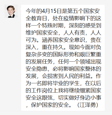 线上学习讨论突破了空间的限制,保证了大家的参与度,在线互动交流也使同学们减少了羞涩,更加畅所欲言,各抒己见。通过交流学习,大家对国家安全法和网络安全法都有了更加深入的掌握,安全防范意识也显著提高。