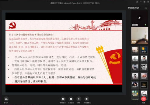 在第一部分中,组织委员吕怡给支部党员介绍了国家安全的含义,并以选择题、问答题的形式给大家科普了国家安全小知识。支部党员们也结合日常生活中的一些事例和此次疫情中类似危害国家安全的现象展开了讨论,并积极分析对策建议。