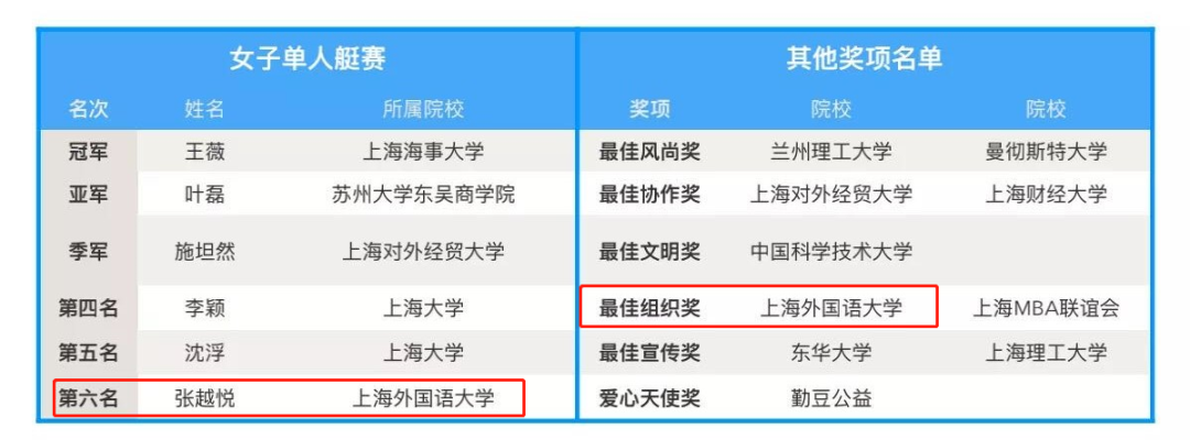 在专业教练的指导下,经过几次团队集训,所有选手在赛事中都超常发挥,勇于争抢和拼搏,团队接力赛挺进半决赛,张越悦校友在女子个人赛中杀入决赛。最终我院MBA获得团体最佳组织奖和女子个人赛第六名,赛事在一片呐喊和欢歌笑语中结束。本次赛事充分展示了上外管院校友们蓬勃向上的精神面貌和运动风采,也体现了学院高效的组织、管理及协调力。