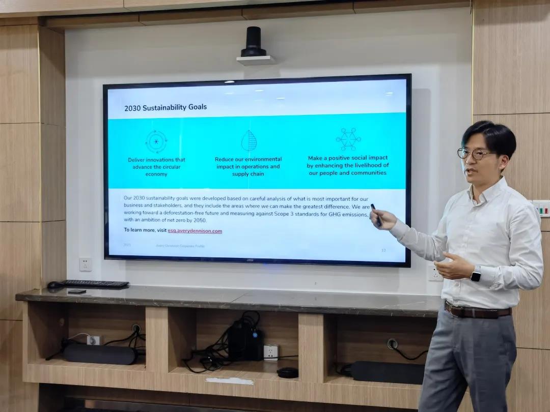 20级PT2班陈悦班长是此次参访的东道主。他给大家介绍了目前艾利丹尼森的经营概况、业务发展、行业应用、企业文化及其倡导的可持续发展、多元化和包容性价值观等话题,让大家对不干胶标签标识行业和艾利公司有了一个基本的了解。
