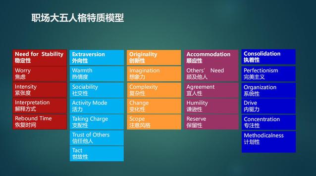 以第一项和第三项为例,稳定性分为有弹性(N-)、部分反应(N=)和安全反应性(N+)特质,创新性分为保守者(O-)、适中者(O=)和探险者(O+)的特质。N-得分者,通常能冷静、沉静地处理压力,高压下表现出色,只承诺自己能力所及之事,而N+得分者,当问题出现时,倾向于自己承担,把别人的问题看做自己的事情,即使这些应该属于别人或者由别人导致的,需要多做有氧运动,消耗压力反应所留存的应激激素。O-保守者,务实、注重战术、执行力强、关注当下,适合的职业是财务经理、项目经理等;O+探险者,富有战略,时常充满好奇,经常内省、反思,追求新颖多变的体验,思考未来时不受思维局限。