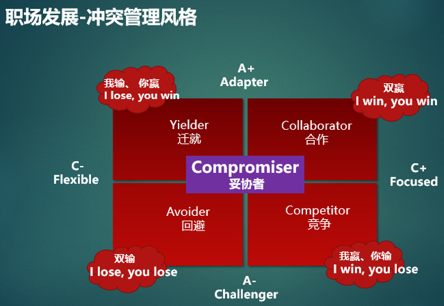 具体到分析团队内部冲突的根源,李老师认为冲突的原因与顺应和执着性两项特质的差异息息相关,形成四种不同的冲突管理风格,即双赢,我输、你赢,双输和我赢、你输。有效的冲突管理者将是双赢者和妥协者,在工作中尽可能将顺从者(A+)和灵活(C-)组合到一起。