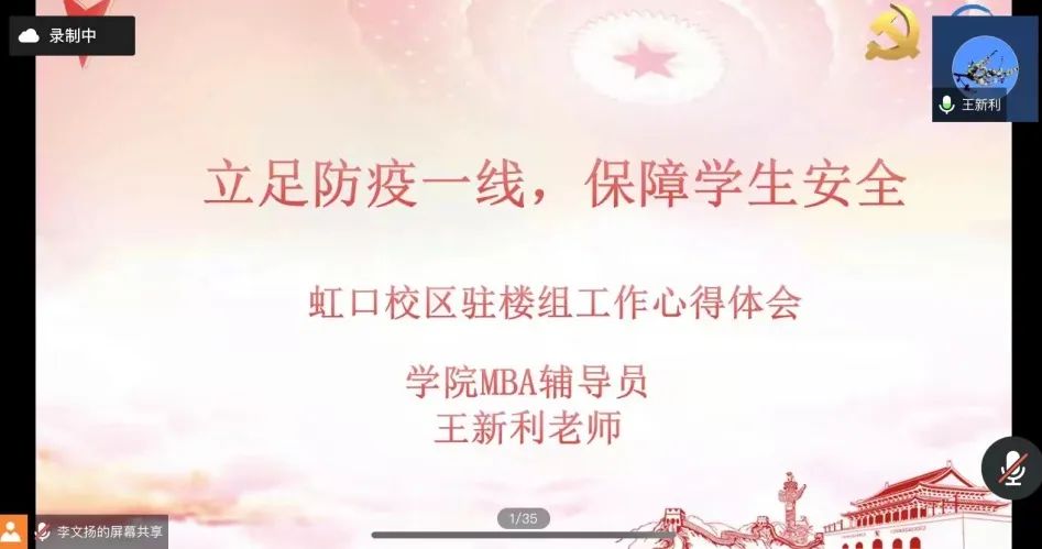其后,学院MBA学生兼职辅导员王新利老师以“立足防疫一线,保障学生安全”为主题介绍虹口校区驻楼情况。王老师先简单了驻楼组的情况和自己的驻楼的经历。她本人从3月13日起开始一线的驻楼工作,对于如何管理学生、如何进行紧急分工部署,起初虽然有些手忙脚乱,从自己缺少驻楼经验到切实做到全面做好学生安全保障,在强烈的责任心和坚持下所有工作都能有序进行。虽然像是“007”般工作模式,但主楼组老师忙并快乐着。同事间相互鼓励,形成了密切的同事情和“战友”情;学生管理不断优化,能够在最短时间内有效的解决学生问题。如今大家共同守护的虹口校区,学生们是安全的,健康的,大家觉得之前一切努力都是值得的。驻楼过程中也有很多感人的故事和亮点。一、充分发挥学生党员的先锋作用,开展特色活动。积极响应党组织要求,3月15日六号楼率先建立了临时党支部,紧接着第二天就开会进行分工部署。学生党员通过每日简讯记录封控管理期的重要讯息,通过采访、收集和整理精彩瞬间制作防疫视频,目前已完成《防疫日记》《我们在一起》《感恩有您》视频,这为其他楼宇的党支部起到带头作用。MBA学生党员也积极投入到各楼宇的临时党支部,切实做到了为同学办实事。二、非党员志愿者同学,面对严峻的疫情,他们是默默的逆行者。他们细心统计用餐需求,分发快递、盒饭,尽职尽责服务师生,一起做好校园保障,共克时艰。三、教师党员做好服务保障和安全稳定工作,协同抗疫,攻克时艰。学校防控手势从封闭管理到准封闭管理再到静态管理过沉重,不仅学生心态在变化,驻楼老师心态也由平静到波动,再到平静,这要感谢来自学校和学院全体师生的努力和关怀。在保障学生日常生活的同时,驻楼组也通过推送线上经典话剧、红色音乐会、专题讲座等缓解学生精神压力,做好维稳工作。最后,王新利老师以学生们自发制作的视频《感谢有您》结束分享。