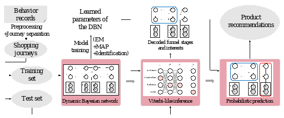鉴于此,本研究提出一种多阶段动态贝叶斯网络方法用于产品推荐。该方法先将消费者在电商平台上的行为记录处理为对应购物过程的序列,并拆分训练集和测试集。而后,训练构建出的动态贝叶斯网络模型,同时设计有关消费者心理阶段转移和兴趣转换的隐层识别策略以约束学习过程。基于学习到的模型参数,提出维特比式推断算法来解码测试集中不可观测的消费者心理阶段和兴趣分布,进而通过概率预测来生成个性化的产品推荐。