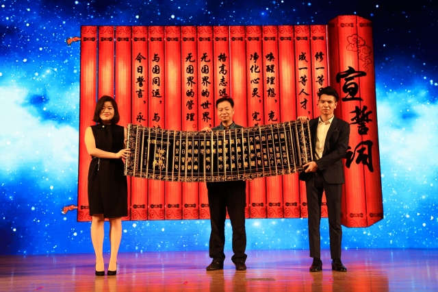 杨力教授的精彩致辞之后,激动人心的音乐响起,两位新生代表鼓舞人心的诗朗诵引出了全体新生的庄严宣誓,并把印刻着誓言的竹简交送给学院,象征着2016级全体新生将对未来的期许寄存,立誓于人,立信为本,用实际行动去实践誓言!徐永老师代表学院接受了这份寓意深刻、分量特殊的竹简。同时,新生还特别赠送给学校一个见面礼:一把长椅,象征着情谊长存。张红玲老师、孙建老师代表学校接受了这份心意,并与学生代表合影留念。