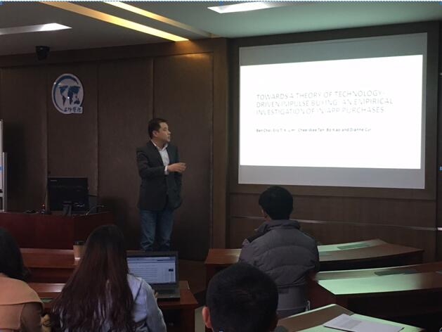 国际工商管理学院执行院长潘煜教授主持了两场学术讲座。潘教授介绍到Chee Wee Tan教授博士毕业后四年在ISR和MISQ上发表了三篇论文,这个成绩在全球MIS系老师中仅占0.7%。CheeweeTan教授的讲座题目是: “The Art of Online Foraging: Adaptive Search in Consumer-Generated Content Environments”。该研究借鉴自然界的觅食理论(foraging theory),分析人在进行信息检索的过程中的方式与策略,并基于用户产生内容构建自适应搜索理论。EricLim教授的讲座题目是:“Towards a Theory of Technology-Driven Impulse Buying: An Empirical Investigation of In-App Purchases”。该研究采用实证调查方法研究了基于手机购物的冲动购买行为。