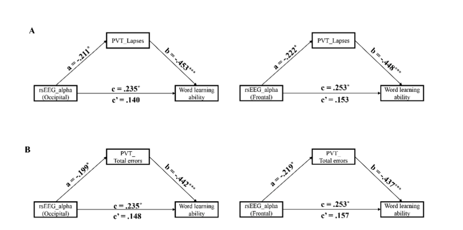 两项研究均验证了警觉注意力在静息态α波振荡与词汇学习能力之间中介效应,提示警觉注意力在促进个体词汇学习能力方面的重要性,并为理解学习过程中的神经机制提供了新的见解。