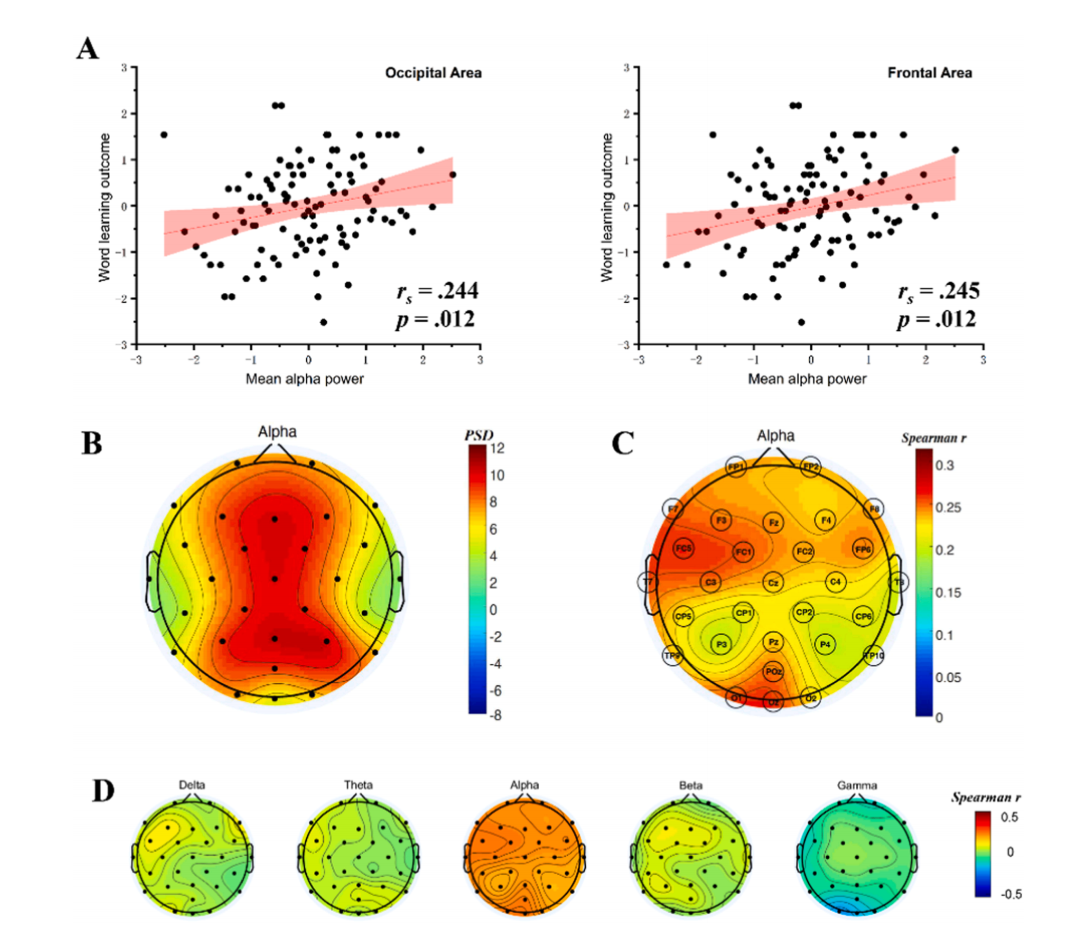 该研究包括两个独立的实验(Study 1和Study 2)。在Study 1中,共招募了105名大学生作为研究对象,采用脑电记录被试静息状态神经活动,然后要求被试完成词汇学习任务和精神运动性警觉测试,结果发现静息状态下枕叶和额叶区域的α波振幅与词汇学习能力有显著正相关,且警觉注意力在这一关系中起到了完全中介作用。