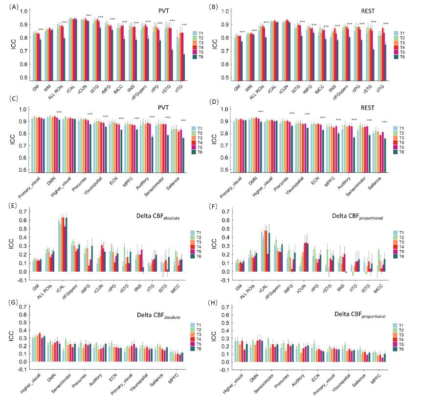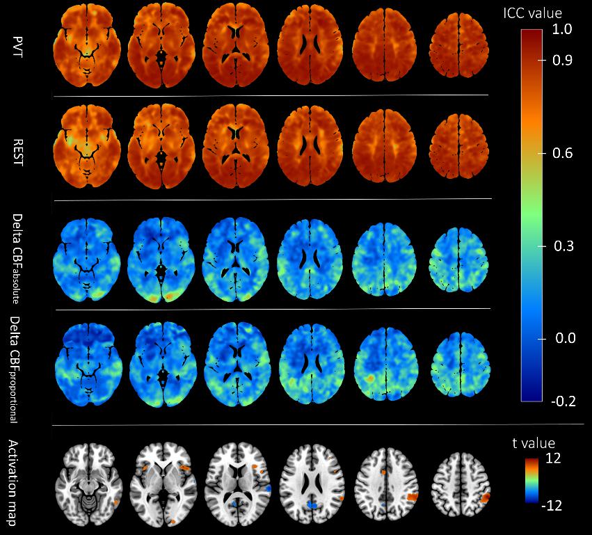 研究结果表明,在静息态和任务态下,绝对脑血流量重测信度极高,但是任务引发的脑血流变化量信度很差。