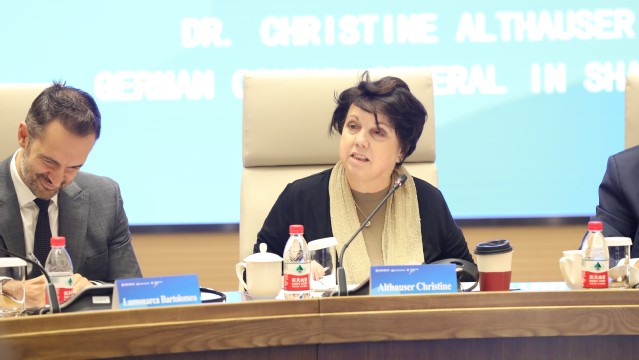 上海全球治理与区域国别研究院执行院长杨成主持对话活动。欧盟成员国驻沪总领事、副总领事等外交官和中国欧盟商会、德国商会代表出席;上海市从事欧洲问题研究的专家学者以及上海外国语大学欧洲文明研究、欧亚文明研究特色研究生班、卓越学院等学生参加了本次活动。