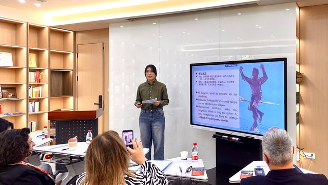 主旨演讲环节,希腊语专业教研室主任胡晶晶以《尼科斯·卡赞扎基斯:中国人民的亲密朋友》为题,回顾了尼科斯·卡赞扎基斯两次访华的经历,解读其对中国文明的深刻理解及与中国人民的深厚友谊。文友会主席卡特琳娜·佐格拉菲斯介绍了协会及卡赞扎基斯博物馆的发展历程和未来愿景,强调其宗旨在于让卡赞扎基斯充满力量的声音持续回响、代代传承。爱奥尼亚大学希腊汉学中心执行主任埃琳娜·阿夫拉米杜从汉学视角出发,分析了作家对中国的观察与记述,并阐释其中蕴含的东西方文明相遇、对话与融合的深刻思考。