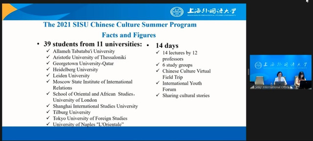 北京时间8月9日下午,2021上海外国语大学中国文化暑期项目正式拉开帷幕。由11所世界知名大学推荐、来自13个国家的39名优秀青年学子相聚“云端”,共同参与此次项目。开班仪式上,对外合作交流处处长张红玲致欢迎辞,教务处处长王风华、国际文化交流学院院长张艳莉、东方语学院院长程彤、英语学院副院长陈琦、教师代表Curtis EVANS等出席。