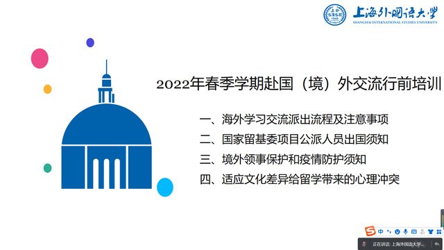 为积极响应教育部关于进一步加强出国留学行前培训工作的精神要求,做好留学服务与管理工作,上海外国语大学2022年春季学期赴海外学习交流学生行前培训于2021年12月16日在线举行。拟于2022年春季派出的100余名国家公派、学校公派本、研学生参加了此次培训。会议由对外合作交流处副处长麻桑主持,各单位外事秘书共同参加活动。