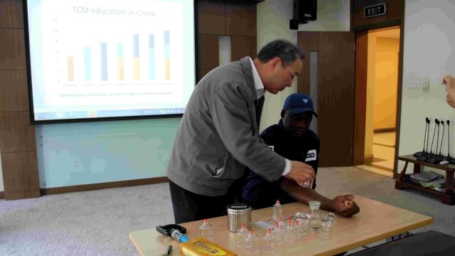 上午,上海中医药大学国际交流处长郑林赟教授为外国专家们介绍了中医药学从形成到繁荣、从继承到创新的轨迹。国际教育学院周文新教授(前马来西亚国际医药大学中医系主任、前美国奥古斯塔大学中医孔子学院中方院长)专题讲解了针灸、艾灸和拔罐等最常见的几种中医疗法,并邀请外国专家现场体验和互动。两位专家深入浅出的英语讲解、深厚渊博的专业知识得到了听众们的热烈掌声。外国专家们踊跃提问发言,并提出自己对中医药学的独到见解。