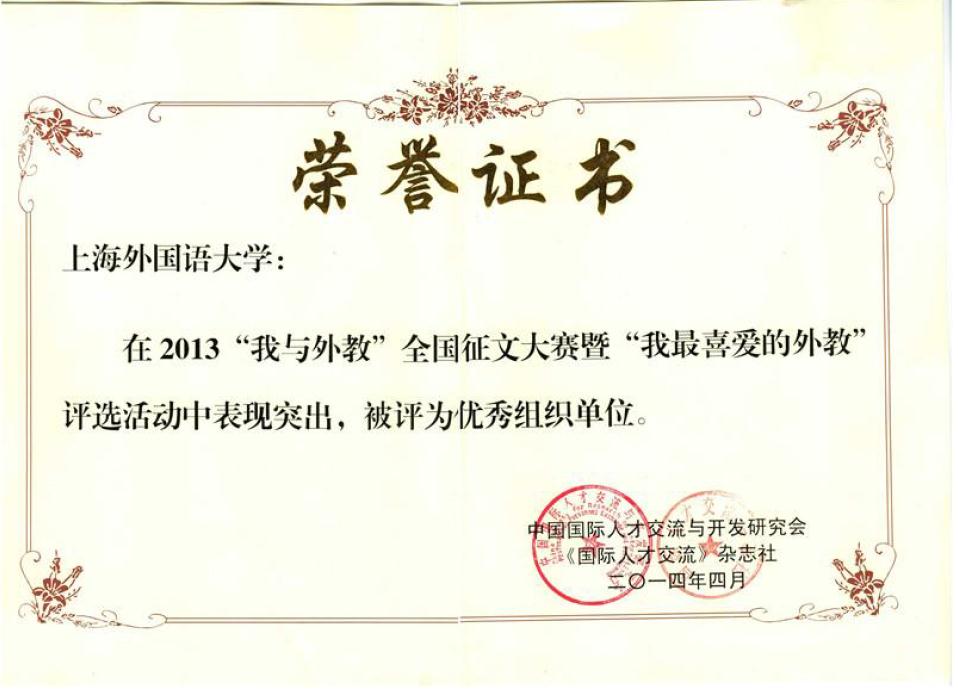 此次活动全国共有5万多篇征文,“我最喜爱的外教”评选活动有各高校单位217名外国专家候选人参与角逐。由于各个院系师生积极投稿,我校共选送了35份优秀作品参赛,并最终取得了很好的成绩。这不仅展现了我校师生与外籍专家之间的友谊,更展现了我校的国际化风采。因组织有序,选送作品量多质优,我校还获得了“优秀组织单位”奖。