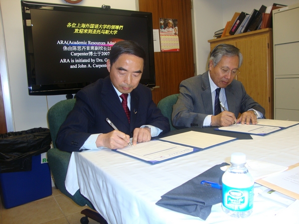上外代表团受到了圣托马斯大学校长、常务副校长的隆重欢迎,六大学院的院长全部出席会谈。在常务副校长陈思齐教授的主持下,双方就学生交流、教师访学、课程共建、专业引进等方面充分交流探讨,陈思齐校长还首次与代表团分享了圣托马斯大学首创的ARA(Academic ResourceAdministration)学术资源管理系统,该项目已经为圣托马斯大学成功申请到了美国政府2500万美元的研究经费。陈思齐先生在美从事教育多年,办学经验非常丰富。他对大学教育理想的孜孜追求、对祖国的殷殷眷念、对华人留学生的拳拳关爱,给代表团一行留下了深刻印象。冯庆华副校长代表上外与圣托马斯大学签订了校级合作备忘录。
