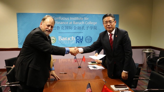 在纽约城市大学巴鲁克学院访问期间,代表团会见了校长Mitchel Wallerstein教授、第一副校长David Christy教授、国际事务副校长Myung-Soo Lee教授、Zicklin学院院长Fenwick Huss教授、副院长Qing Hu教授等人,出席了上海外国语大学与纽约城市大学巴鲁克学院合作建立的国际金融孔子学院的启动仪式,会见了孔子学院外方院长Mathew LePere和中方院长孙信伟教授等,并与出席启动仪式的纽约校友会部分校友合影留念。姜锋与Mitchel Wallerstein校长围绕孔子学院建设、两校金融和管理等专业合作以及朝鲜半岛局势等进行了富有成果的交流,签署了合作协议。