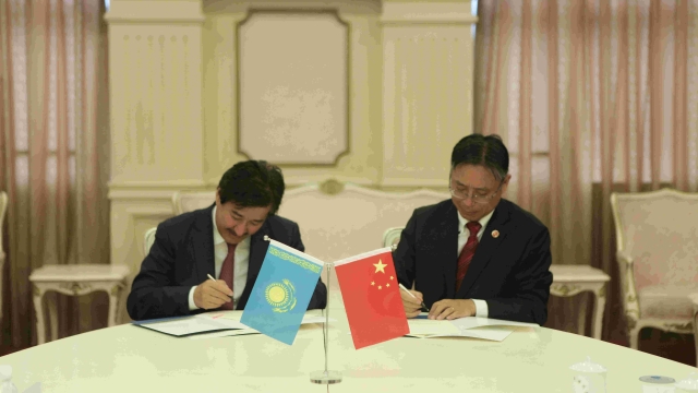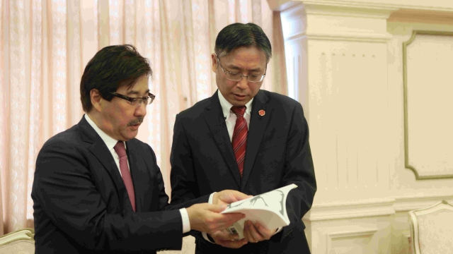 姜锋与穆塔诺夫签订了上海外国语大学和哈萨克斯坦阿里-法拉比大学合作协议书,并互赠礼物。