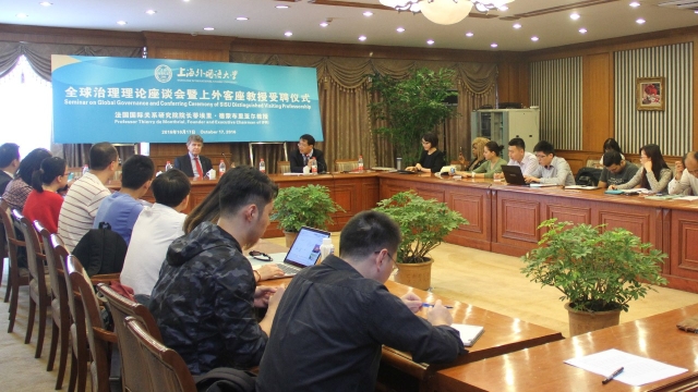 17日上午,德蒙布里亚尔出席在上外虹口校区会议中心举办的全球治理理论座谈会。会议由上外国际关系与公共事务学院院长郭树勇教授主持,上外国别区域研究领域的部分学者教师、法语系与国关学院研究生等三十余人参加座谈。