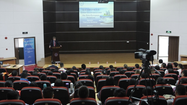 10月17日下午,法国国际问题研究院院长蒂埃里·德·蒙特布里亚尔教授在上海外国语大学松江校区图文西厅发表演讲,与上外师生就全球治理、国际关系、中法与中欧关系等议题交流见解。