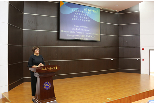 在随后进行的演讲中,米兰达局长首先介绍了联合国和联合国教科文组织的历史、宗旨、人力资源管理机制以及总部和区域组织治理架构。然后,她以自己在联合国系统工作的经历,详细讲解了联合国系统国际公务员的招录标准、程序、员工绩效评估模式。随后,围绕“为什么要去联合国教科文组织工作”这一问题,米兰达局长寄语上外学子努力学习,立志为人类进步和世界发展做贡献。