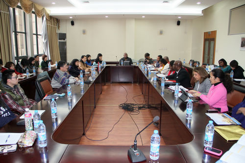 228日下午,美国城市联盟代表团一行15人访问上海外国语大学松江校区,并与上外师生座谈交流。座谈会由美国研究中心负责人王恩铭教授主持。英语学院部分教师和研究生参加了活动。
