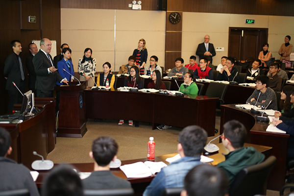 会见结束后,部长阁下欣然题词祝愿上外与怀卡托大学的合作持久成功。随后,他在曹校长的陪同下观摩了上外与怀卡托大学2+2合作项目的教学情况,并即席作了演讲,鼓励该项目的学生努力完成学业,同时与学生进行了互动交流。