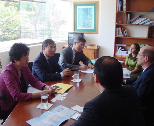 中午12时,吴书记一行抵达秘鲁天主教大学,受到了天主教大学校际关系事务主管Alberto Ferrand Noriega及国际发展办公室主任Jeannette Sampe的热情欢迎。吴书记首先介绍了我校的基本情况及学科优势,希望在孔子学院的基础上,进一步加强两校在国际关系、金融、经贸等人文社会科学领域的合作,并欢迎天主教大学东亚研究的学者来我校交流访问。Alberto Ferrand Noriega教授向吴书记一行介绍了秘鲁天主教大学的概况,也表达了在多个领域与我校开展合作的意愿。随后双方就合作开办东亚研究硕士课程进行深入交流并达成了初步共识,就互派留学生等事项也交换了意见。会谈结束后,双方互赠纪念品并合影留念。