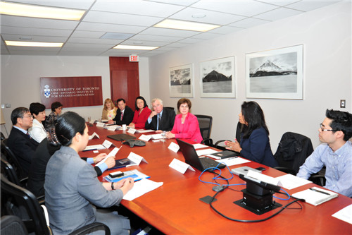 在结束了蒙大拿大学的访问之后,代表团赴加拿大访问多伦多大学(University of Toronto, UT)和多伦多大学密西沙加分校(University of Toronto Mississauga, UTM)交流访问。多伦多大学非常重视上外代表团的来访,来自各院系、部门的9位负责人参加了会谈,其中包括来自著名的罗特曼管理学院(Rotman School of Management)、多伦多大学规模最大的文理学院、继续教育学院、安大略教育研究中心(Ontario Institute for Studies in Education, OISE)以及国际办公室的负责人。会谈中,吴书记对上外的历史、现状和未来发展战略进行了介绍,表示希望与多伦多大学在教育专业、英语专业等方面展开合作。上外代表团还会见了多伦多大学密西沙加分校校长、多伦多大学副校长Deep Saini和教务长Diane Crocker,并就行政培训、MBA教师交流和学生交流、聘请专家授课等合作形式进行了深入洽谈。多伦多大学历史悠久,科研水平高,规模大,师资力量强,教学质量高,是一所优秀的公立大学,具有较高的合作价值,是较为理想的合作伙伴。此次访问建立了双方的信任和了解,为建立校际合作奠定了基础。